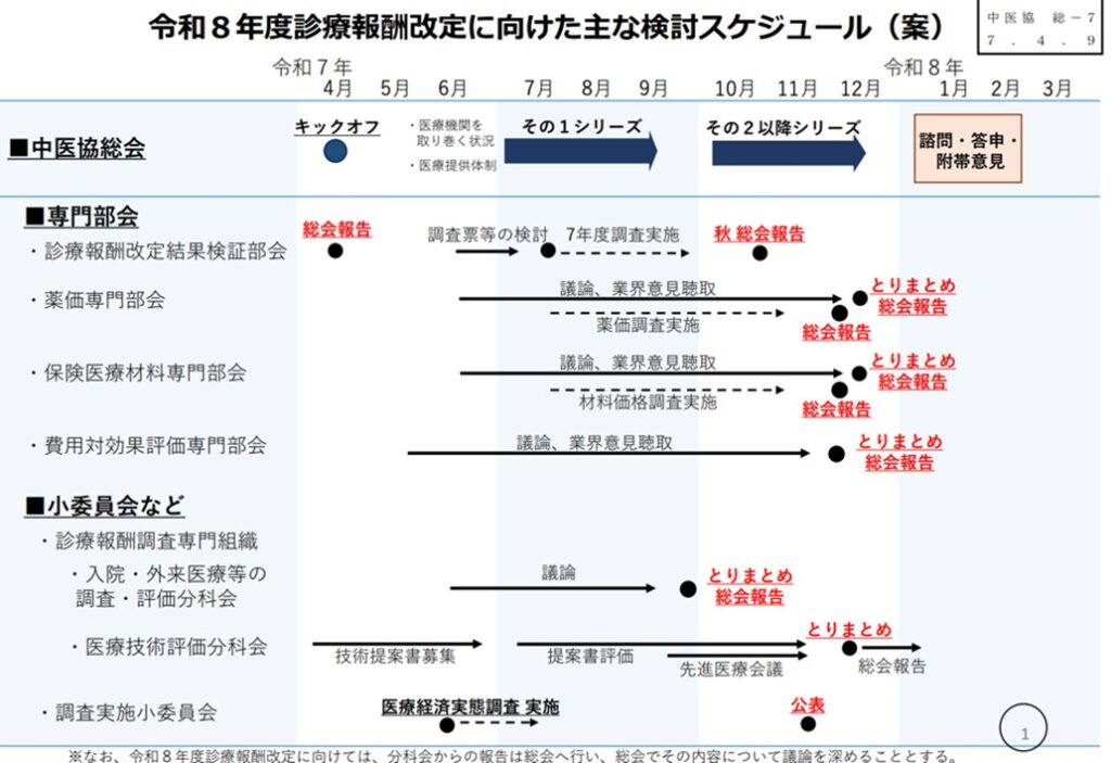 診療報酬改定に向けた中医協での検討は、通常、改定前年の春の総会報告を起点として始まる。その後、年間を通じて各種議論や調査結果の整理が進められ、最終的に冬の総会で取りまとめが行われる(資料1)。